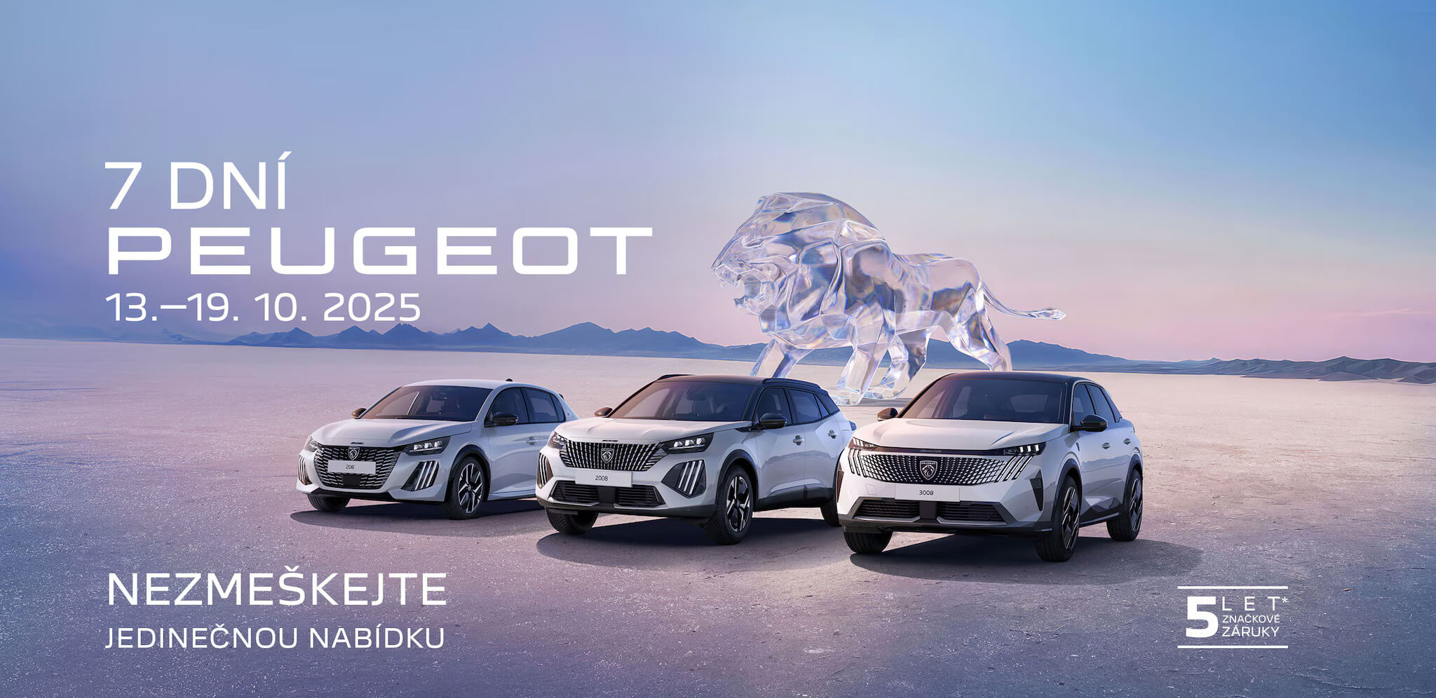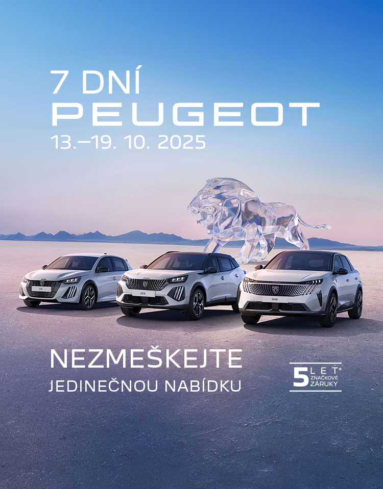 Foto je pouze ilustrativní. Nabídka 7 dní Peugeot je platná od 14.10.2024 do 20.10.2024 a vztahuje se pouze na nákup nového osobního vozu (s výjimkou nových modelů 3008/5008). Celá nabídka je platná pouze na skladové vozy.